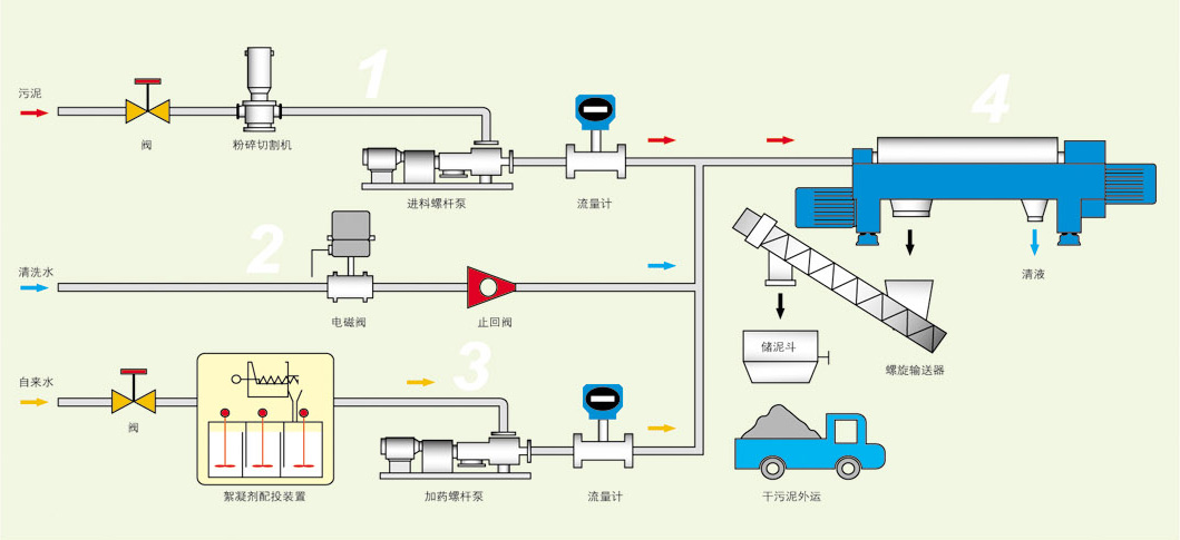 壓縮階段:螺旋推進(jìn)器將沉降固體推送至卸料端,污泥在離心力的作用下得到進(jìn)一步壓縮,并釋放出孔隙水。